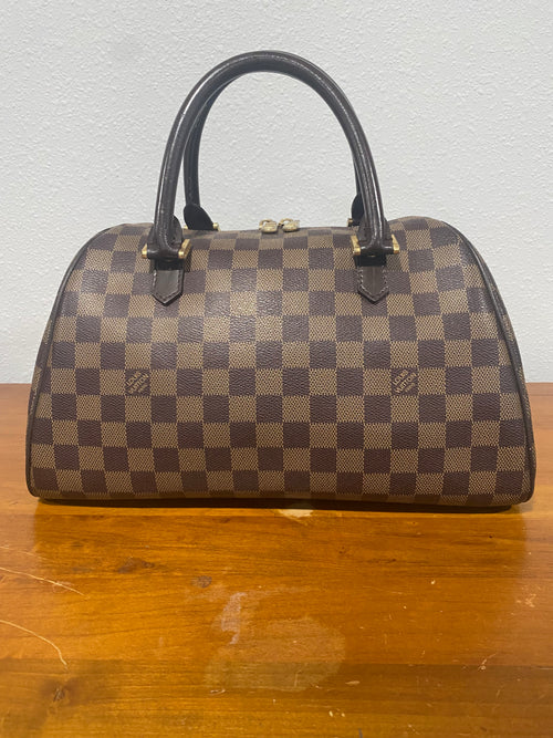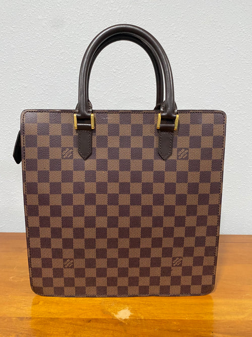 Classic monogram canvas satchel in brown with tan leather handles. Structured silhouette with secure zip-top closure and reinforced leather trim. Timeless design for professional everyday use.